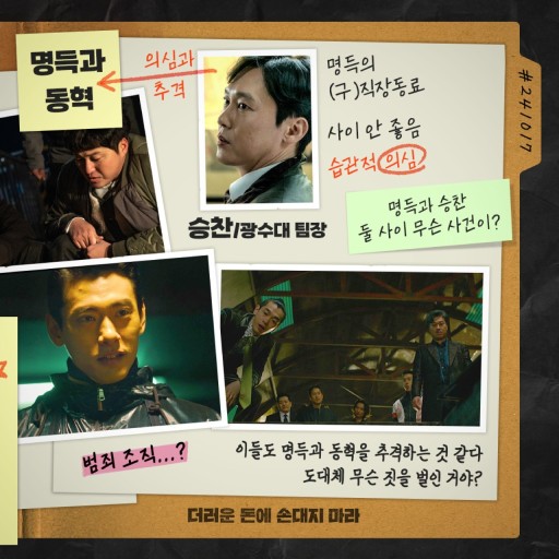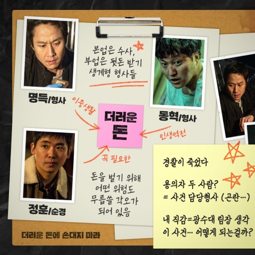 수사도, 뒷돈 챙기는 부업도 늘 함께 하는 생계형 형사 ‘명득’(정우)과 ‘동혁’(김대명). 우연히 범죄 조직의 검은돈에 대한 정보를 입수한 두 사람은 인생 역전을 위해 신고도, 추적도 불가한 돈을 훔치기로 계획한다. 그러나 완벽한 계획을 세웠다고 생각했던 현장에서 잠입 수사 중이던 형사의 죽음으로 사건은 꼬여만 간다. “어차피 우리가 저지른 일, 수사하는 것도 우리야” 살인으로 번져버린 사건을 ‘명득’과 ‘동혁’이 직접 수사하게 되고 ‘명득’과 악연으로 얽힌 광수대 팀장 ‘승찬’(박병은)이 수사 책임자로 파견된다. 그리고, 은폐하려 했던 현장 증거까지 두 사람을 점점 압박해 오는데… 목숨 걸 자신 없다면 ‘더러운 돈에 손대지 마라’